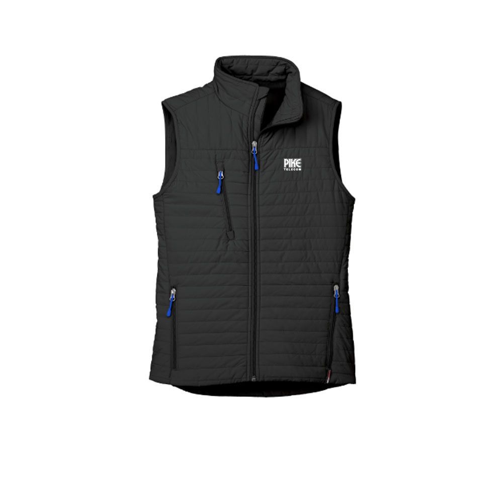 sku: PT003125This 100GSM Thermolite insulatied vest offers great warmth without weight. Features 1 in. quilt pattern. Water resistant and windproof fabric makes this vest warm in any weather. Chin guard and full storm flap behind zipper at warmth and comfort. It also has 3 easy-access zippered pockets. Pike logo on the left chest. Custom blue zipper pulls. Pike Telecom logo embroidered on the left chest.