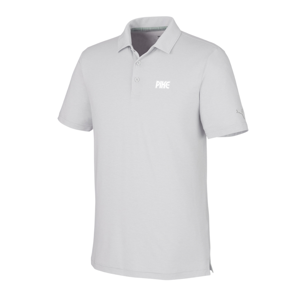 sku: PKPG100HRPuma Golf Men's Bandon polo. 69% polyester, 26% lyocell 5% spandex jersey; The fiber lyocell from Lenzing is a sustainably sourced, renewable and bio-degradable botanic fiber; Moisture-wicking and antimicrobial performance ; UPF 30+;Self-fabric collar with three-button placket ; Left sleeve silicone logo and woven logo on back right hem; Side vents; Stretch performance; Active fit, easy care. Pike logo embroidered on the left chest.