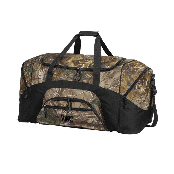 sku: PK0BG99CThis rugged duffel features the outdoorsy Realtree Xtra camo pattern. 600 denier polyester canvas with 210 denier polyester lining D-shaped zippered entry for easy access in main compartment Two large zippered end pockets Two exterior zippered pockets on front Padded handle Detachable, adjustable shoulder strap Dimensions: 12.75"h x 27.25"w x 13.5"d;