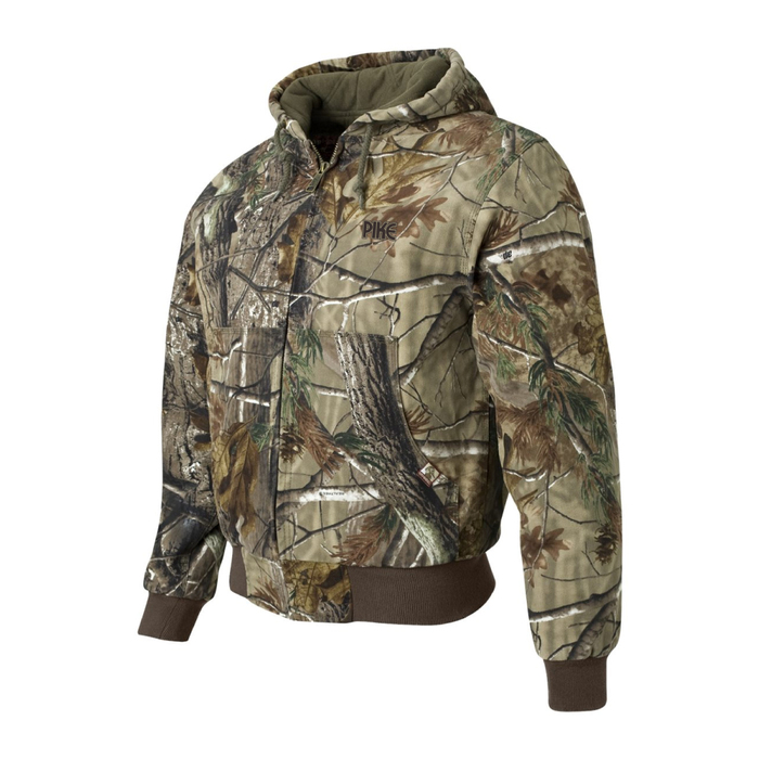 sku: PK05020CDri Duck Cheyenne hooded Boulder cloth heavyweight cotton canvas jacket is garment washed for softness and triple-needle stitched throughout. It is 12 Oz. 100% cotton garment-washed canvas with a quilted brushed tricot "soft touch" polyfill lining, full zip front with Dri Duck zipper pull, 3 piece hood, quality spandex-blend rib-knit trim and cuffs, oversized front pouch pockets and inside patch pockets with snap closures, and an inside cell phone/media pocket. Pike logo embroidered on the left chest.