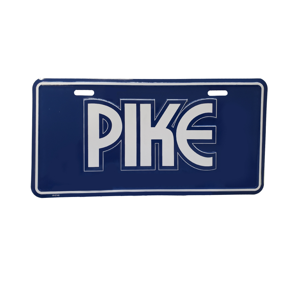 sku: PKPPLATEEmbossed Pike license plate. 12" x 6". .032” aluminum. This product is manufactured from recycled aluminum. Navy Blue with white logo.