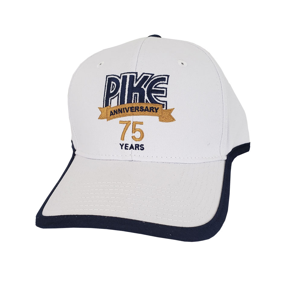 sku: PK00075WPike 75 Year Anniversary cap. 6 panel brushed twill fabric. Structured with a velcro closure. Sewn eyelets with 8 rows of stitching on the visor. Pike 75 Year Anniversary logo embroidered on the front panel.