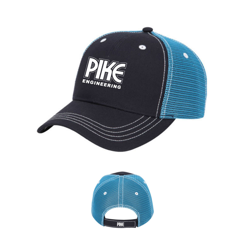 sku: PE00996Cotton Twill Trucker Mesh. 6 panel structured cotton twill with mesh side and back panels. Pike Engineering logo embroidered on the front panel.
