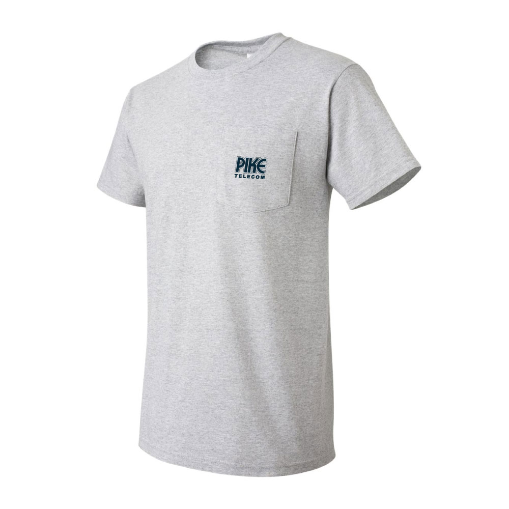 sku: PT3930P5.6 oz. 90/10 cotton/polyester tee shirt with pocket. Taped shoulder to shoulder, 2 needle sleeves and hem. Pike Telecom logo screen printed on the pocket. This product is not FR.