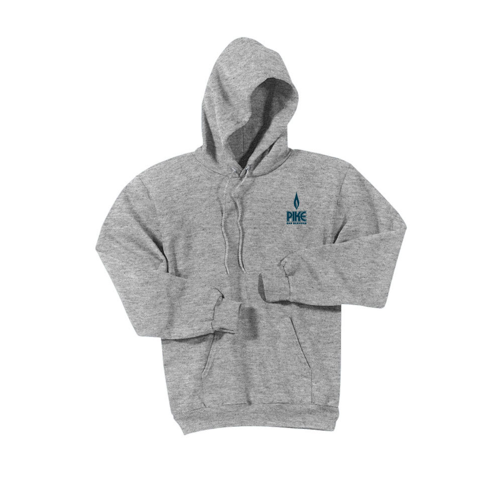 sku: PG090HACozy, no-nonsense sweats for adults and youth. Made with 9 Oz., 50/50 cotton/poly fleece. Two-ply hood with dyed-to-match drawcord, set-in sleeves and front pouch pocket. Pike Gas logo.