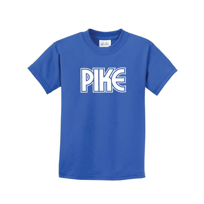 Youth Heavyweight 6.1 ounce, 100% cotton. Shoulder-to-shoulder taping. Pike logo printed in white.
